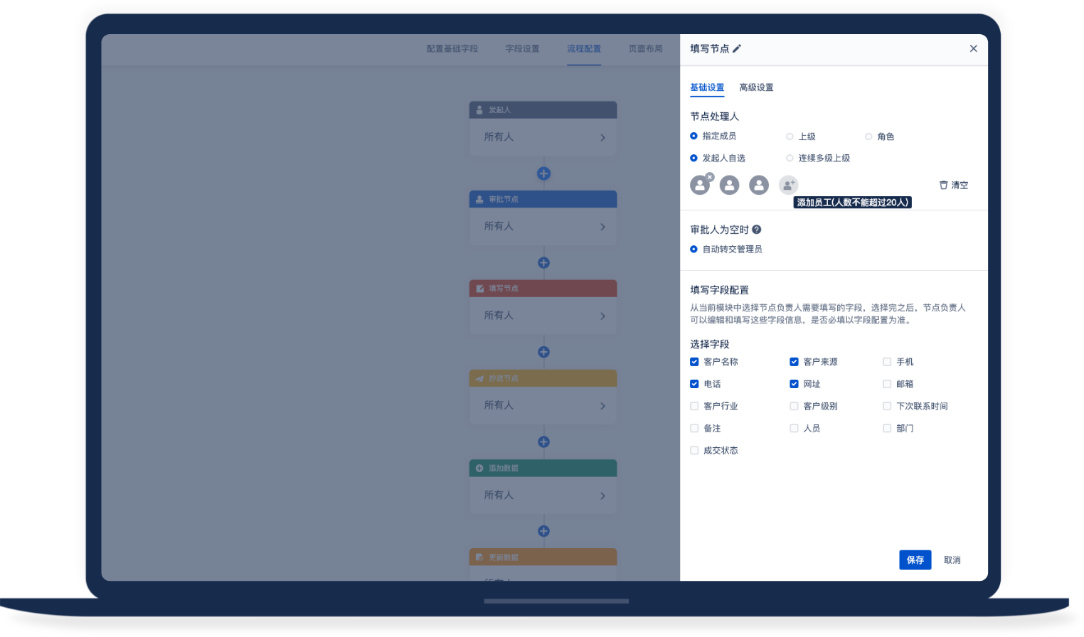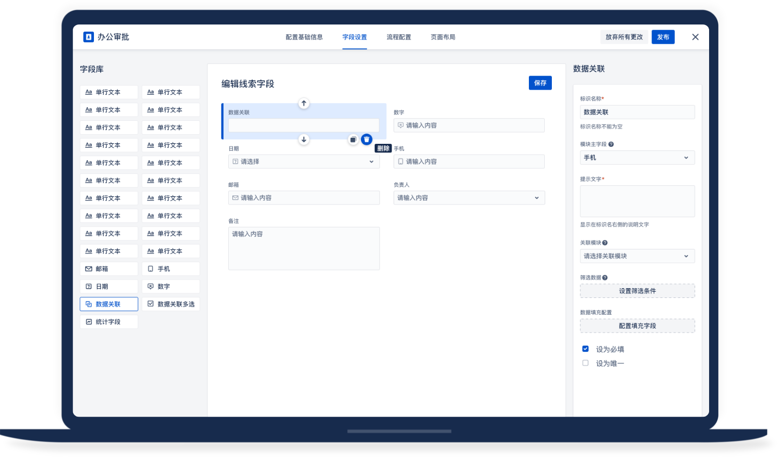 僅通過簡單拖拽,即可創建強大的表單,字段類型豐富,布局樣式多變,邏輯公式充足,極大地提高數據收集效率,幫助企業獲取客戶全景信息!
